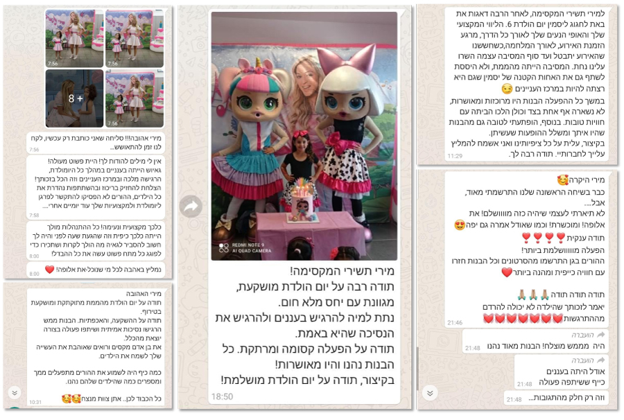 זאת עבודה מספקת כל כך! לראות את התגובות של הילדים, לקבל מחמאות מההורים שגרמנו לילד שלהם להיות מאושר ביום ההולדת. אני כבר 12 שנה בתחום ועדיין מתרגשת מכל המלצה של אמא.